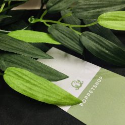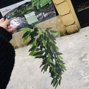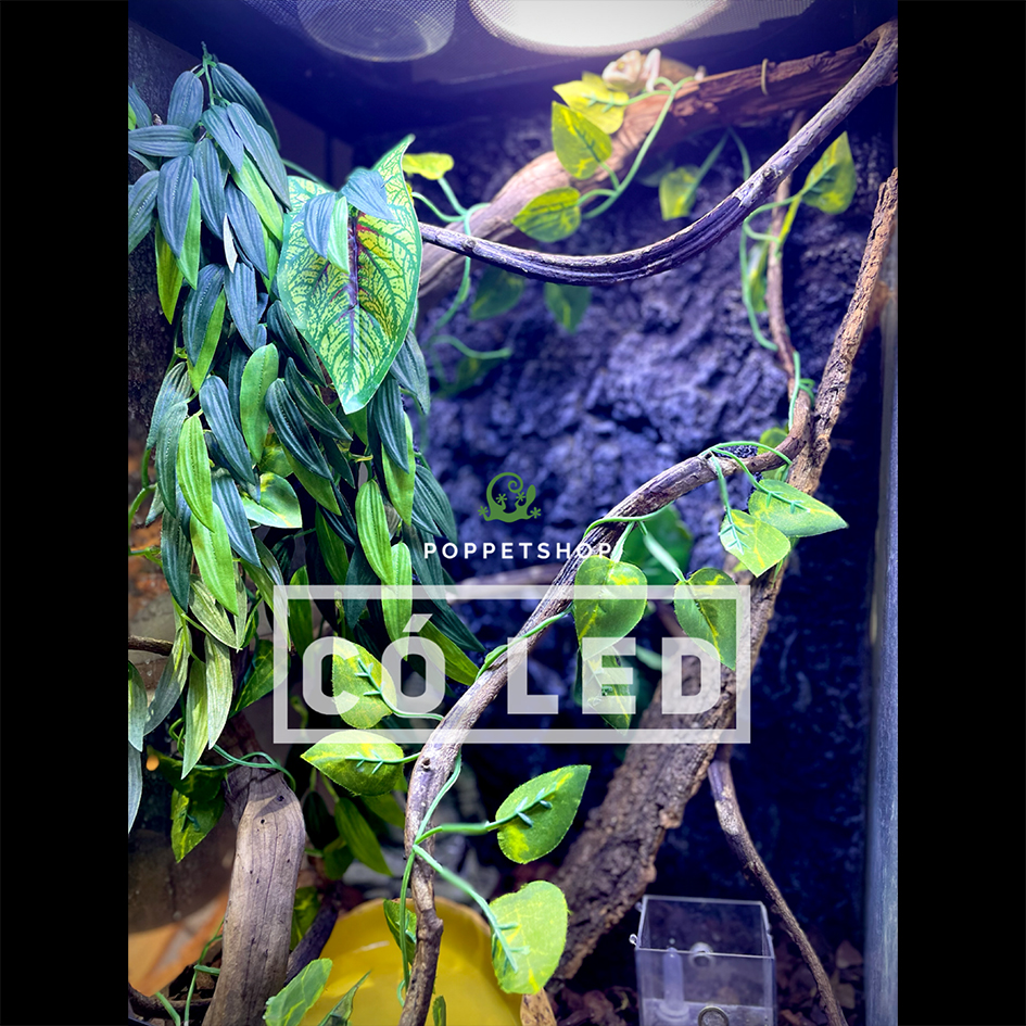 Khác với những sản phẩm cây giả có đế cứng đặt ở góc chuồng. Sản phẩm lá trúc này sẽ ở dạng treo hoặc dán vào kính ở phía trên. Nhiệm vụ chính là che 2 góc trái phải của chuồng. Bạn có thể thấy nó đã làm trọn nhiệm vụ ở tấm ảnh trên. Nếu bỏ ra, bạn sẽ thấy 1 mảng kính lớn bên trái bị thừa thãi.